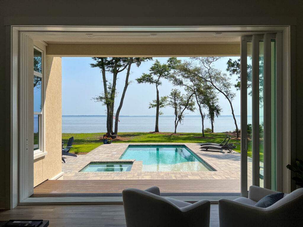 • Drainage Systems: Beaufort County is flat, and heavy summer storms are common. We often integrate “deck drains” or French drains into the design (averaging $1,500 – $3,500) to ensure water flows away from your home and pool.